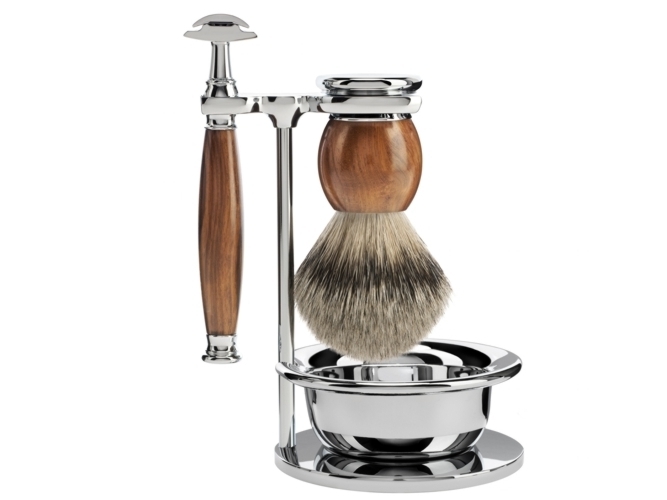 Vierteiliges Rasierset von Mühle aus der Sophist -Serie mit klassischem Rasierhobel ( Nassrasierer für traditionelle Flachstahlklingen ) und Rasierpinsel mit Besatz aus Silberspitz - Dachshaar. Die Griffe von Rasierhobel und Rasierpinsel sind aus Eisenholz und verchromtem Metall gefertigt. Holz ist ein Naturprodukt, bei dem es zu Farbabweichungen und verschiedenen Maserungen kommen kann Inklusive Halter und Seifenschale aus verchromtem Metall.