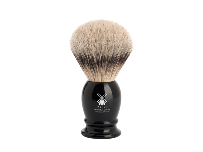Rasierpinsel von MÜHLE aus der CLASSIC Serie mit Besatz aus Dachshaar (Silberspitz Dachszupf) und Fuß aus schwarzem Edelkunstharz, Ringgröße 21mm.