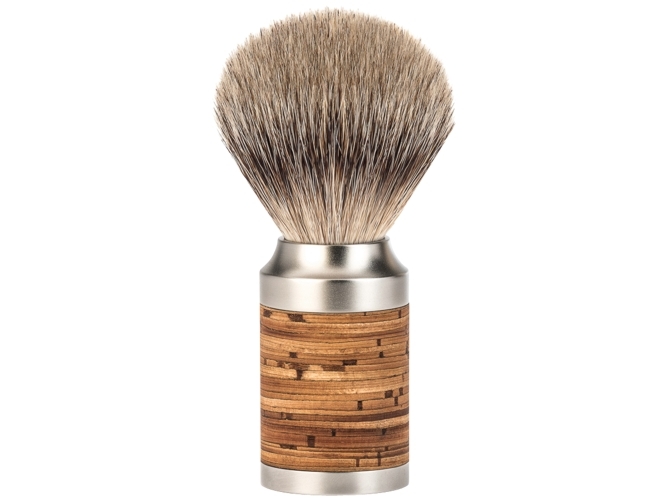 Mühle Rasierpinsel aus der ROCCA Design Serie mit Besatz aus Silberspitz - Dachshaar (Handarbeit), Griff aus mattiertem Edelstahl und aufwendig geschichteter Birkenrinde. Der Birkenrindenkork ist langlebig, auch im nassen Zustand angenehm griffig. Ringgrösse 21mm, Höhe ca. 105mm.